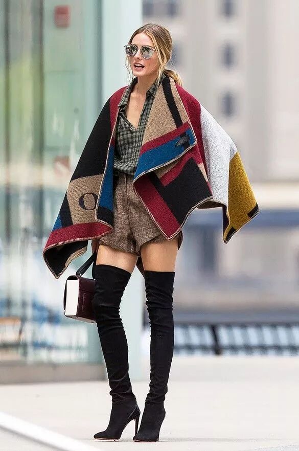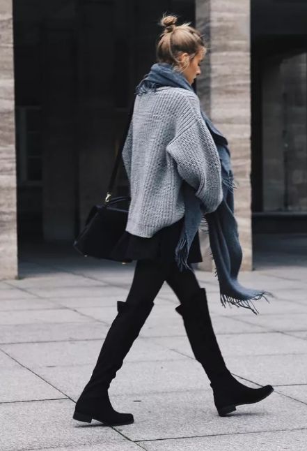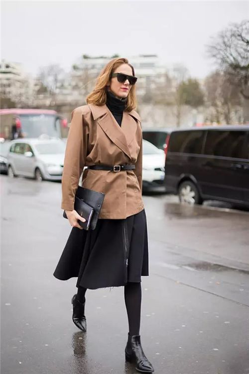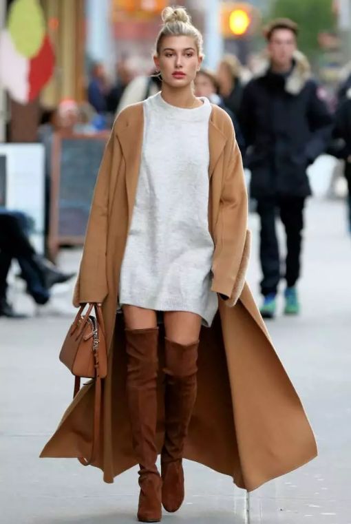 而如果擔心牛仔褲與過膝長靴容易將腿部比例分割成兩截,那麼直接用同色小黑褲搭過膝長靴,就可以穿出無敵大長腿。