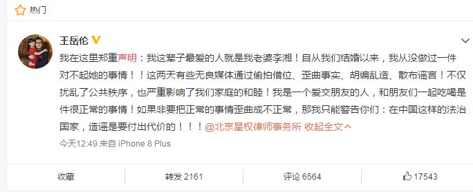 然後王嶽倫繼續辟謠,向吃瓜群眾申明:我這輩子最愛的人就是我老婆李湘!