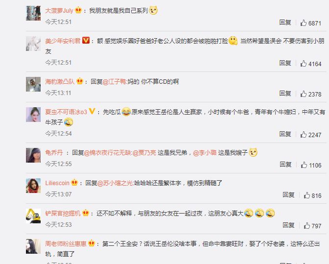 隨後王嶽倫辟謠,聲稱女生是他朋友的馬子。沒攔住熱心群眾的火眼金睛,熱評里一片綠: