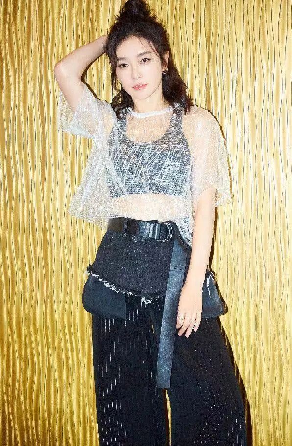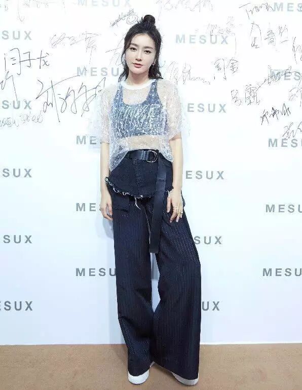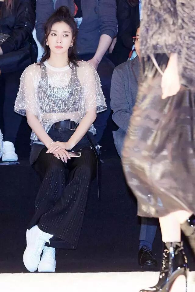 秦嵐穿這一身衣服,坐在台下,很是吸睛呢!這身裝束真不是一般人能駕馭的,喇叭褲加透視上衣,幹練中又不缺乏女人味。