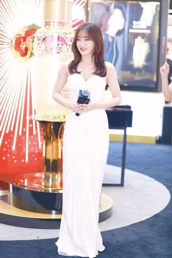 她可是難得穿的如此性感呢,穿上一條白色吊帶裙,很是清新時尚呢,這大V領口的設計,讓她的事業線盡顯。