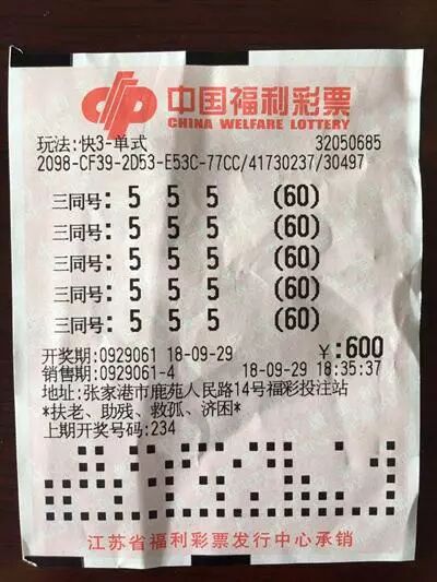 32050685站點位於張家港市鹿苑人民路,離福彩中心較遠。站點機主親自開車帶著中獎彩民來到福彩中心兌獎。他介紹說,這位中獎彩民是站點老彩民,在他站點投註了很多年,特別喜歡快3玩法,以前只要有空就去他站點聊天、購彩。9月29日晚,中獎彩民看準豹子號「5、5、5」,倍投300倍,連追幾期後,終於中得三同號獎金7.2萬元。據了解,這位中獎彩民投註快3經驗豐富,經常中得快3萬元獎。