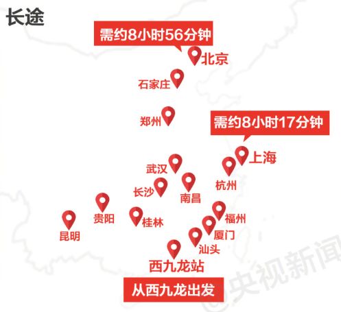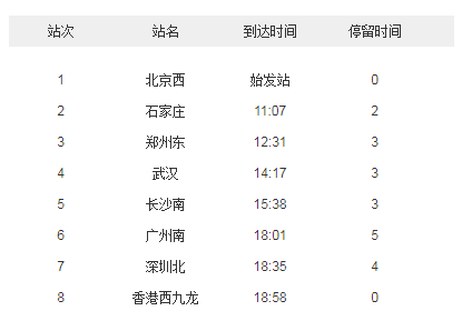 北京到香港高鐵站點:北京西-石家莊-鄭州東-武漢-長沙南-廣州南-深圳北-西九龍