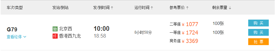 1、從北京直達香港九龍西高鐵為G79,從香港九龍西直達北京高鐵為G80,每天各只有一班,二等座票價1077元,歷時約9小時。
