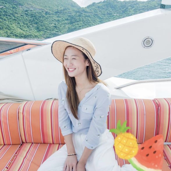 張寶欣清新可人,出海時她帶著一頂大圓邊闊帽,藍色恤衫配搭白色闊腿褲,完全融入大自然之中。