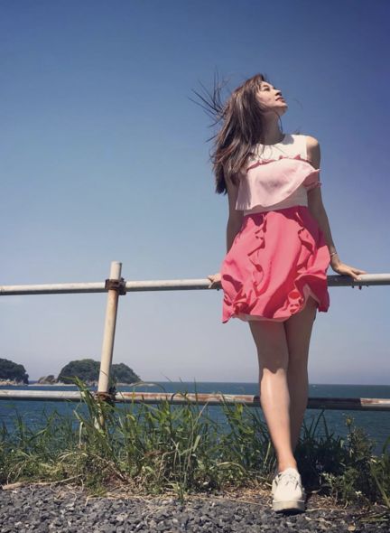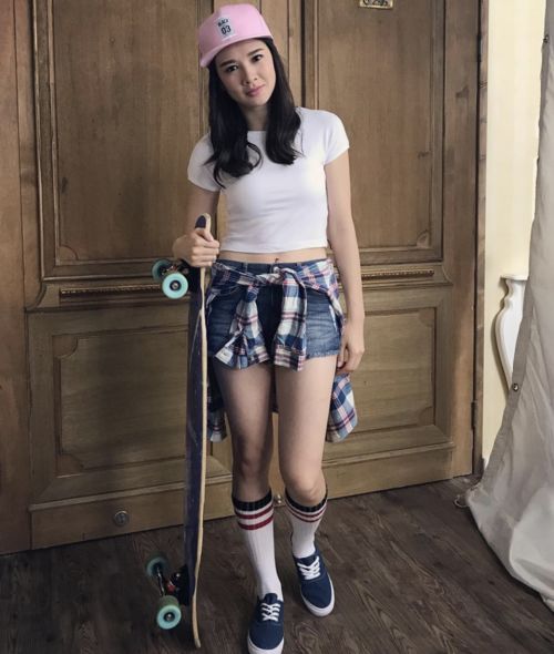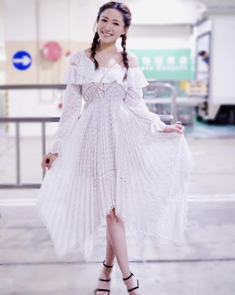 邱晴穿起藍白連身百折裙,像個美少女戰士一樣。配搭一對藍色長襪,令身型更顯高挑,運動風之餘亦十分青春可愛,年輕就是無敵!