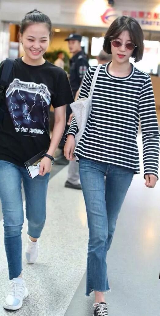 黑白條紋的上衣簡單又不失個性,特別的簡約的風格,搭配了牛仔褲看起來有點青春了,非常的學生風了,很有個性了