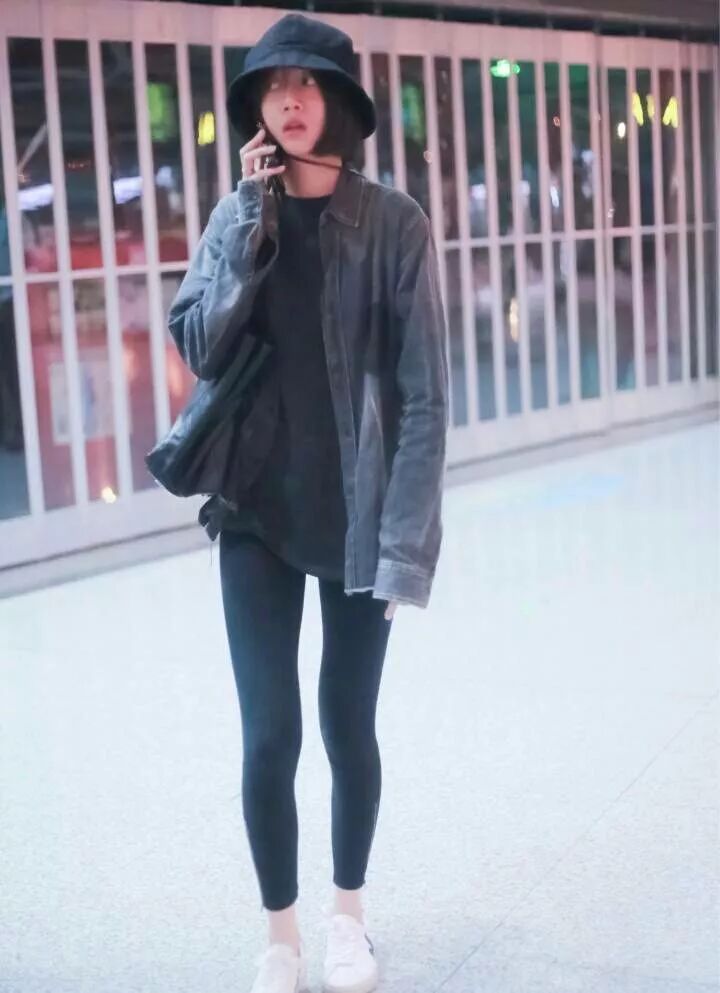 灰色的襯衫外套有點休閒的感覺,搭配了黑色的緊身褲,把腿型都展現了出來,白色的鞋子也是比較的簡約的風格了