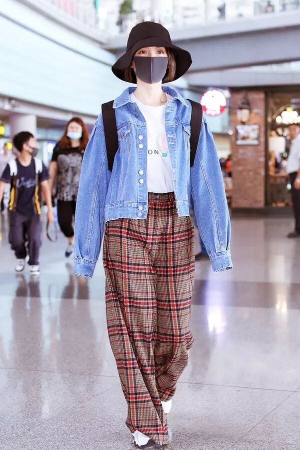 吳昕的牛仔外套搭配格紋闊腿褲,不過姐建議闊腿褲的長度可以再短點,露出一點腳踝會更適合~