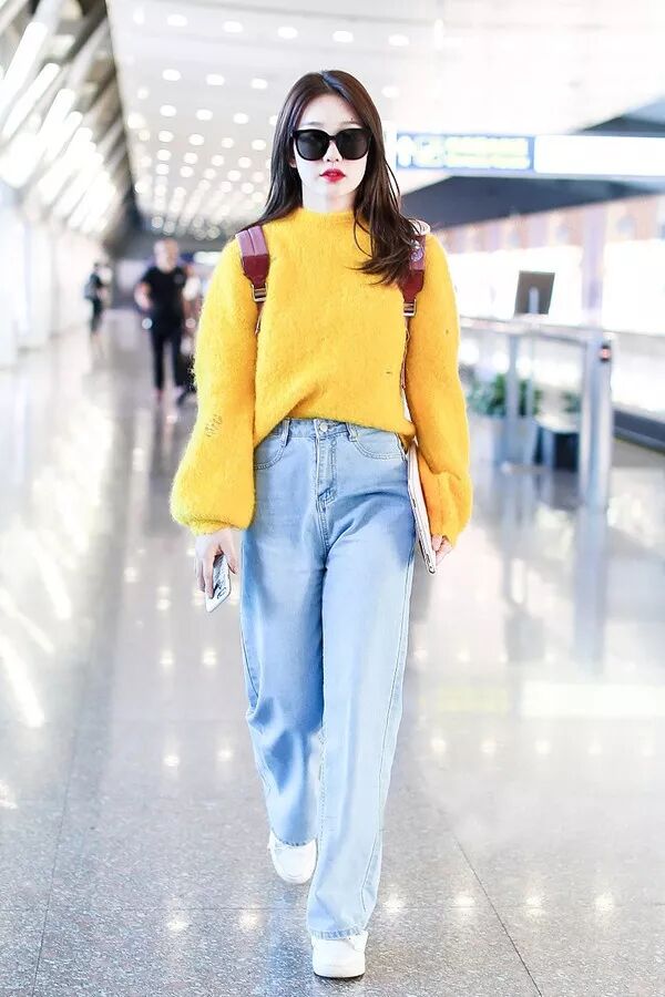然後,徐夢潔也穿了黃色套頭毛衣搭配牛仔褲,不過黃色更鮮艷一些▼