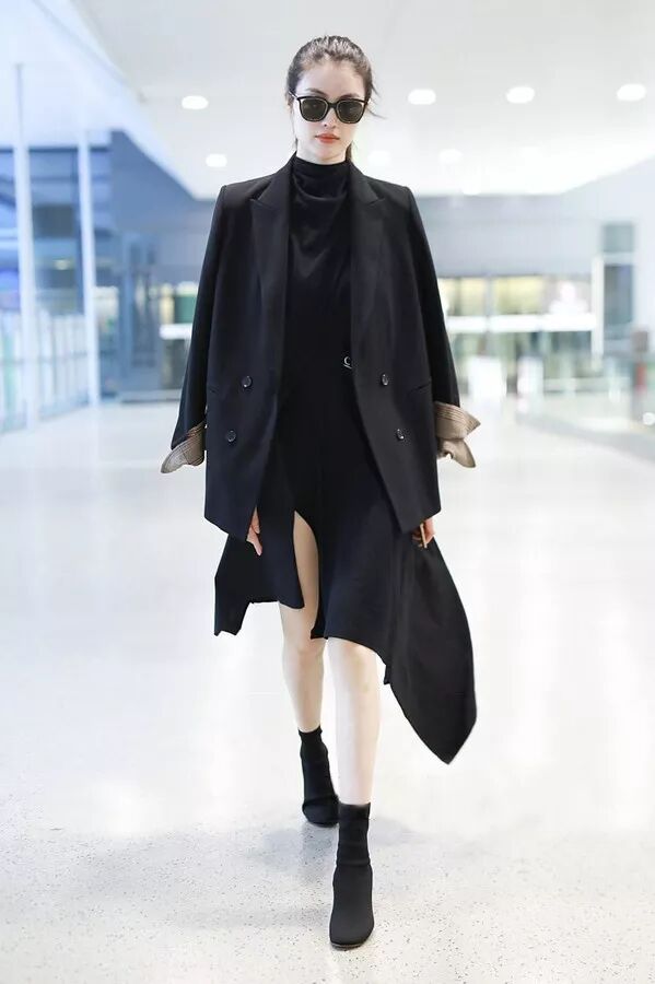 江疏影的oversize黑皮衣搭配微喇叭牛仔褲和短靴,成熟的氣質型。