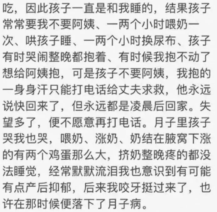 一兩個小時喂一次奶、換尿布,哄孩子睡覺,哭鬧的時候整晚抱著,還要忍受著漲奶、奶結的疼痛。她哭了很多次,還患上了月子病。