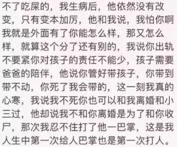 可他居然說了一句:「你好好帶孩子,你帶不動了,你死了我會帶的!」
