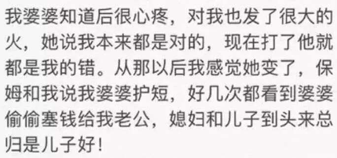 而婆婆嘴上說著看在孩子的面,她會管。可是卻一直在勸她要為了孩子忍,說的話都是我們常見的那幾句: