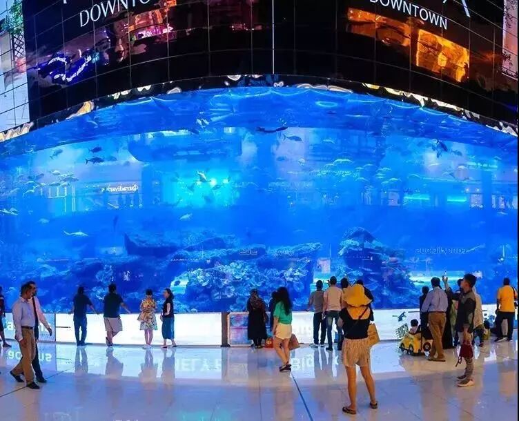 「另外這里有很多有意思的地方。比如The Dubai Mall里面有一個巨大的水族箱。里面還有好多鯊魚。盯著看半個小時都不膩,看是不用門票的。還可以買票去水底隧道,也可以體驗喂鯊魚和下水深潛。」