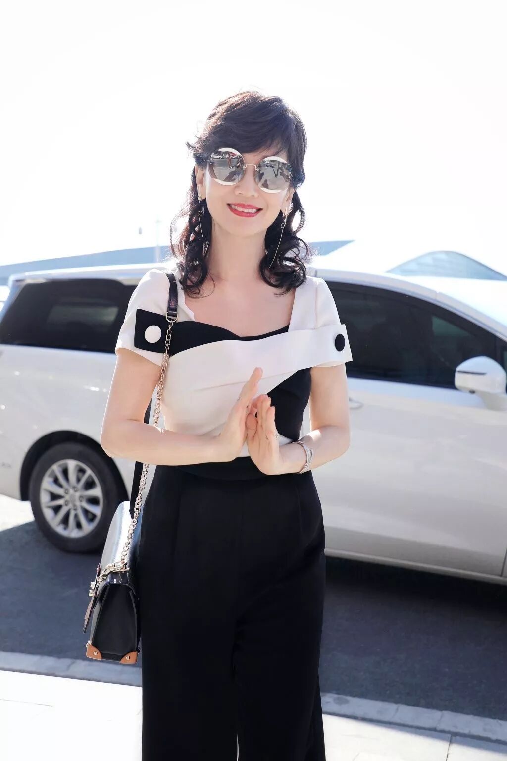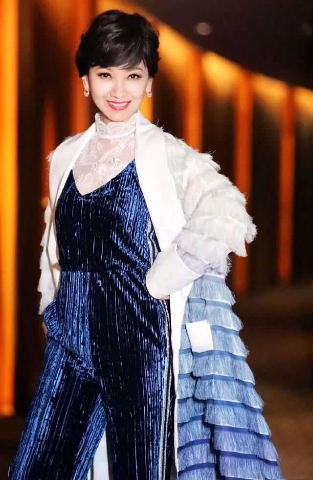 藍色的吊帶連體褲,凸顯趙雅芝大長腿,讓她更加接地氣,同時順條紋的款式,更加大牌,吸引大家眼球,穿出洋氣感覺