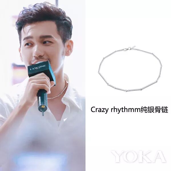白宇哥哥戴上Crazy Rhythmm的純銀骨鏈,也是有點禁欲系哦!搭配白襯衫真的很帥了!這是去年剛在倫敦創立的設計師品牌,工作室在北京,價格通常集中在幾百元,很容易入手的,在北鑼鼓巷的TowerOneSelect集合店可以買到,某寶也有專賣店。