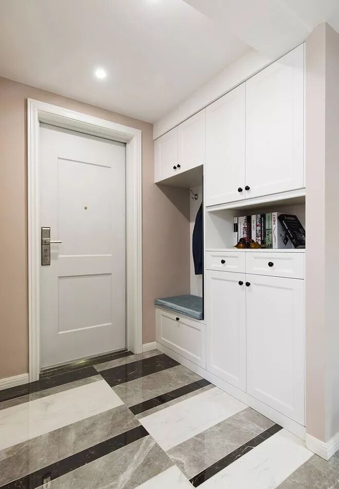 玄關在一處做整體櫃,內嵌形式並不影響整體感,地面不規則地拼接著色彩鮮明的拋釉磚。
