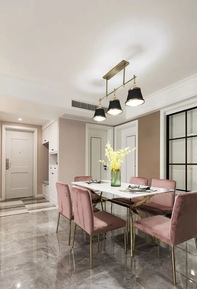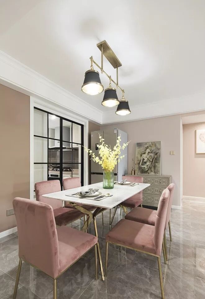玄關正對著開放餐廳,餐桌是金屬桌腳配大理石板,絲絨靠背椅十分復古。