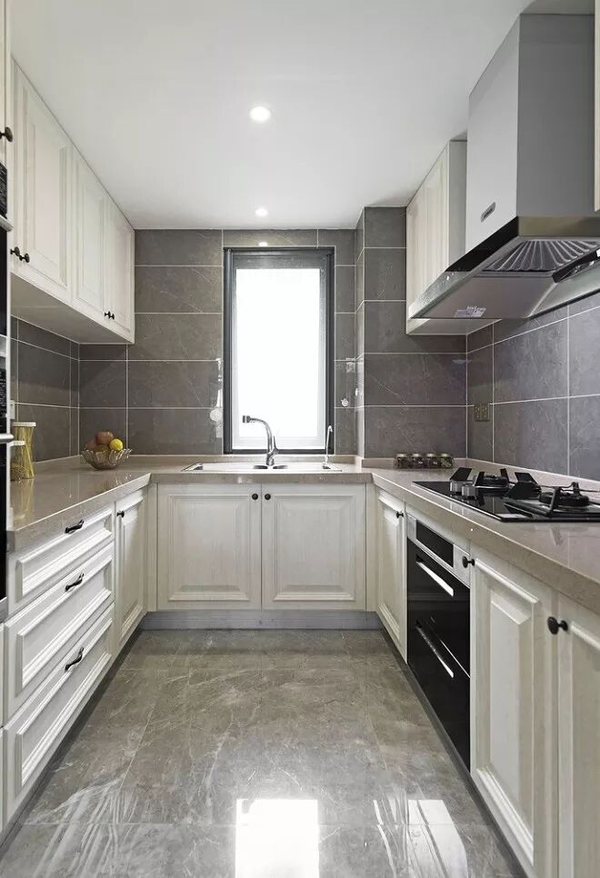 廚房間採用了U字型操作台,最大化的利用了空間。瓷磚選用了800*800的大面磚,左右兩側切小。