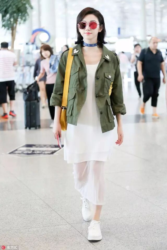 工裝風的外套其實很適合混搭,特別是搭配白色的連衣裙,軍綠色都能穿出清新感。