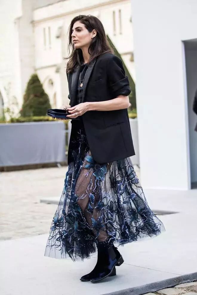 除了毛衣呢,利落感的西服外套搭配紗裙會呈現不同的氣場,也很值得一試