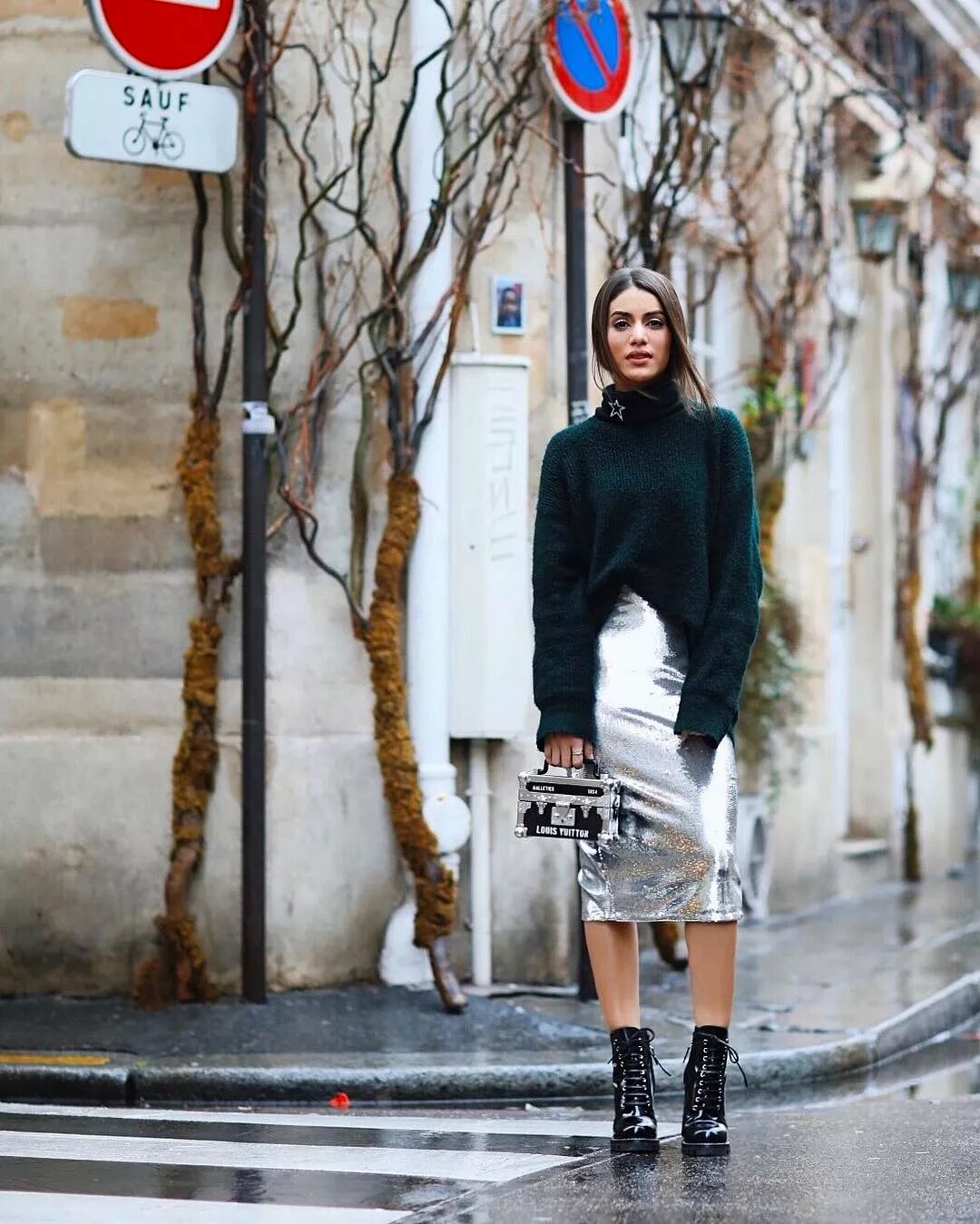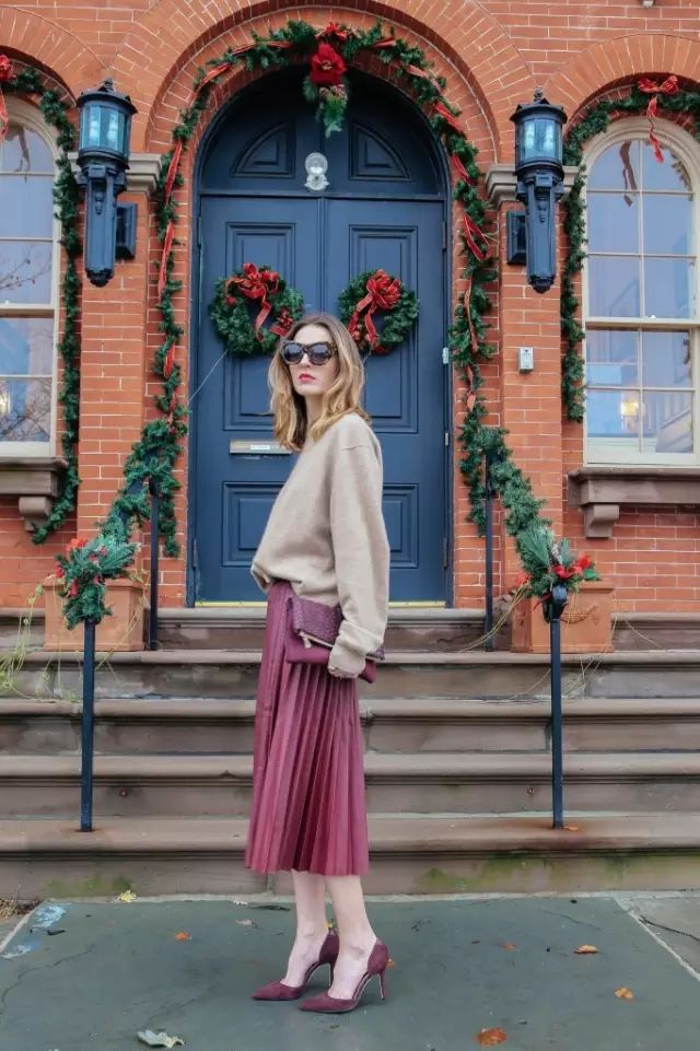bling bling的金屬色百褶裙無疑會是拗造型利器,而用沉穩大氣的大毛衣與之組CP,則能很好地中和掉它的張揚感,讓整身造型看起來更加和諧耐看。