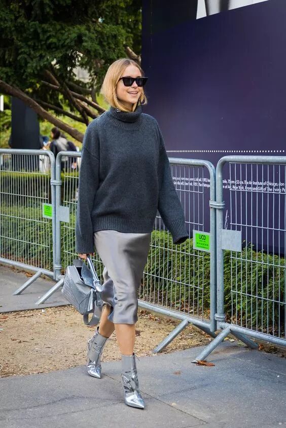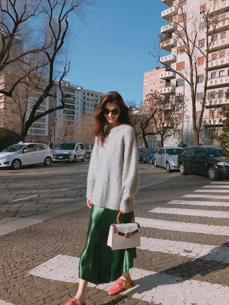 今年秋冬最火的莫蘭迪色系大毛衣搭配緞面裙,高冷高貴的氣質最是讓人過目不忘,十分迷人。