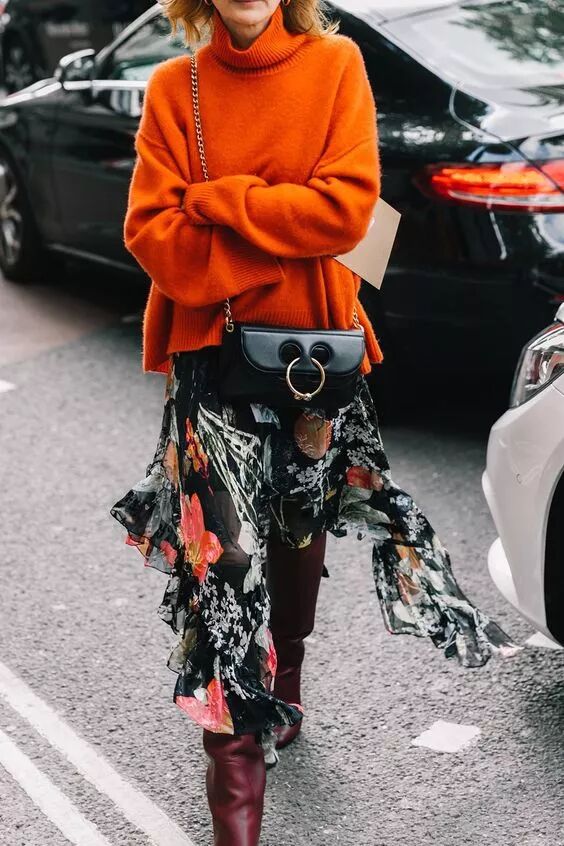 大毛衣與印花裙在色彩上相呼應則是更高階的搭配套路,整體搭配會更具整體感,怎一個美字了得!