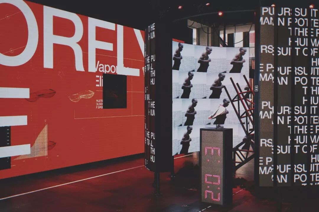 在主門的左邊,是一個LED屏,螢幕中間呈現了兩雙鞋——ZOOM PEGASUS TURBO 和 NIKE ZOOM VAPORFLY ELITE,這整個板塊都凸顯「BREAKING2」突破極限、激發潛能的主題。