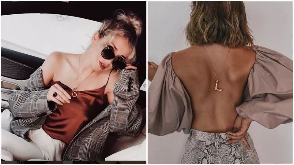 充滿女人味的細肩帶和大露背裝,戴上粗曠的項鏈,有種帥氣優雅交織的衝突美~