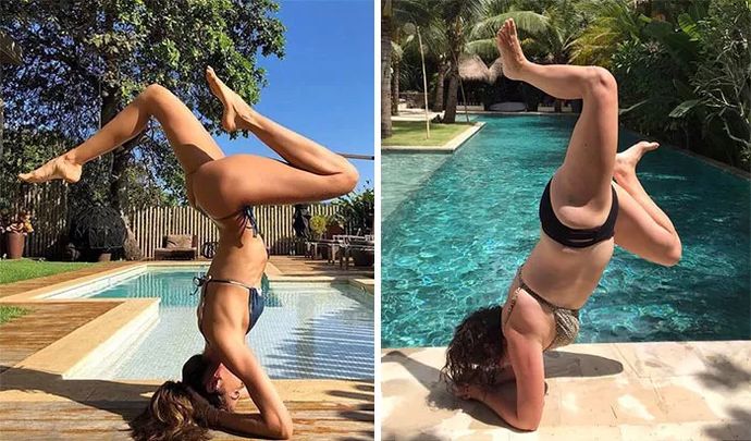 泳池邊上一個美美的倒立