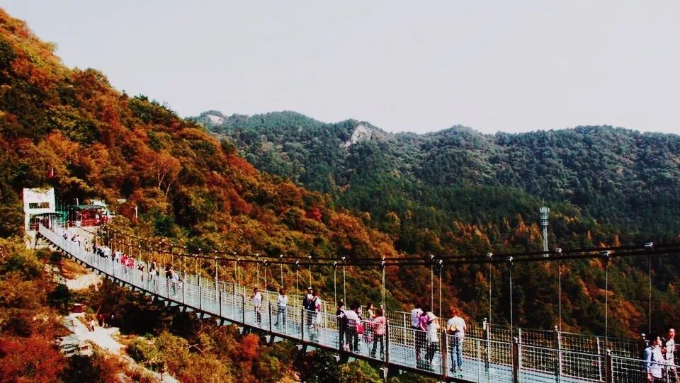 隨後,我們來到了木蘭天池景區內著名的楓葉橋,這座全透明的天橋 是一道秋日出遊必須打卡的地標。玻璃天橋獨特的通透感,如今在深秋的時節里,又被楓紅與秋黃裝點得分外綺麗。