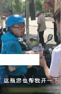 手拿兩瓶水的路人咦「手用不上力」為由,像坐在電動車上吃東西的外賣小哥求助,小哥二話沒說就幫路人擰開了瓶蓋。