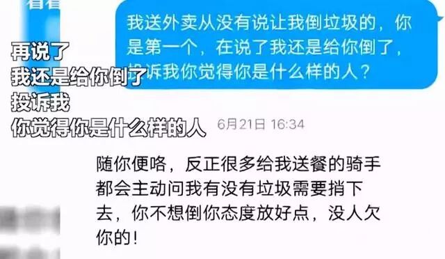 從二人溝通的簡訊可以看出,小王覺得自己的工作職責僅僅是準時把餐品送達顧客手中,沒有義務提供倒垃圾這樣的「特殊服務」: