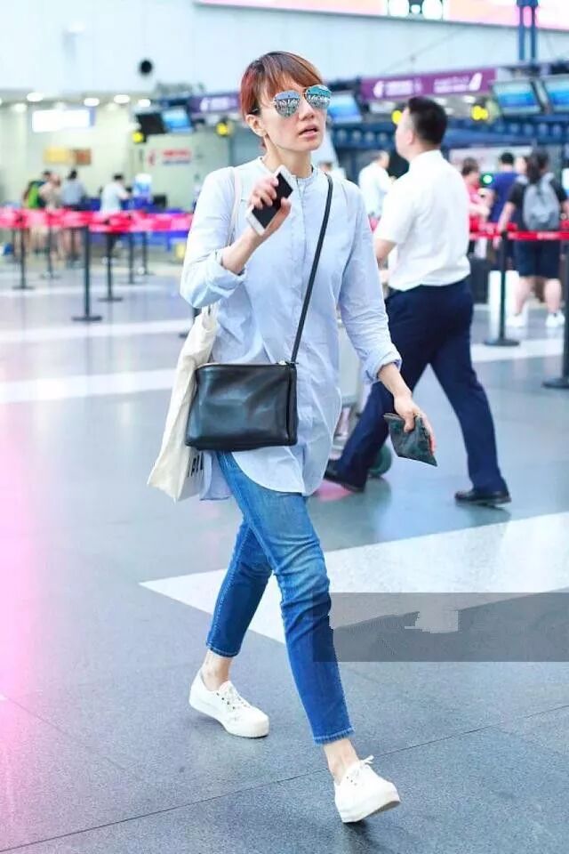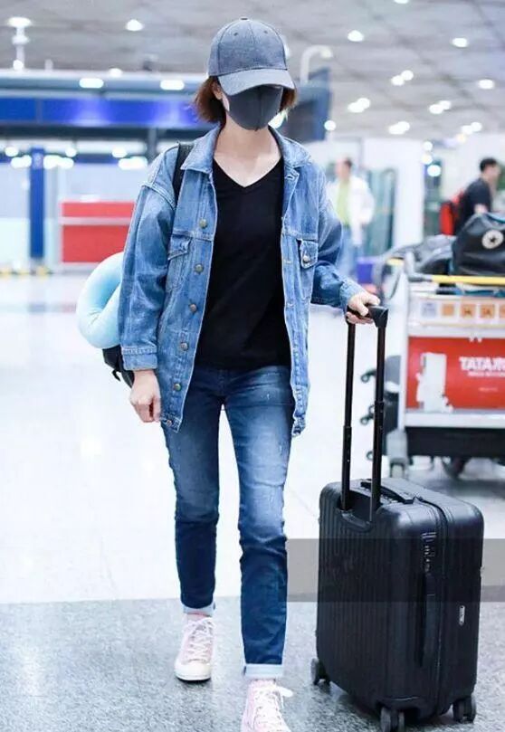 袁泉之前在機場穿一身牛仔衣,太有架式兒了,牛仔外套內搭黑T,這樣的搭配比較經典時尚,同時配粉色帆布鞋, 充滿了少女氣息。