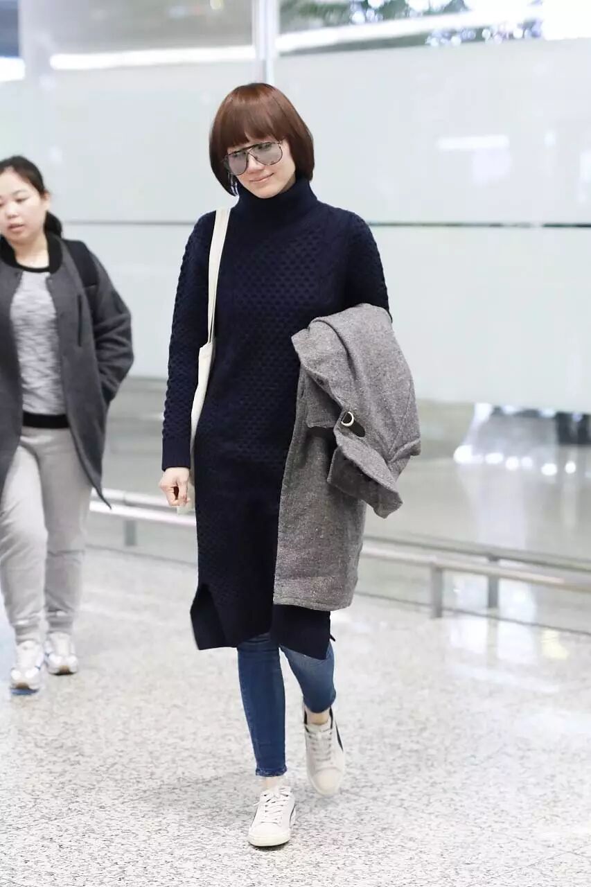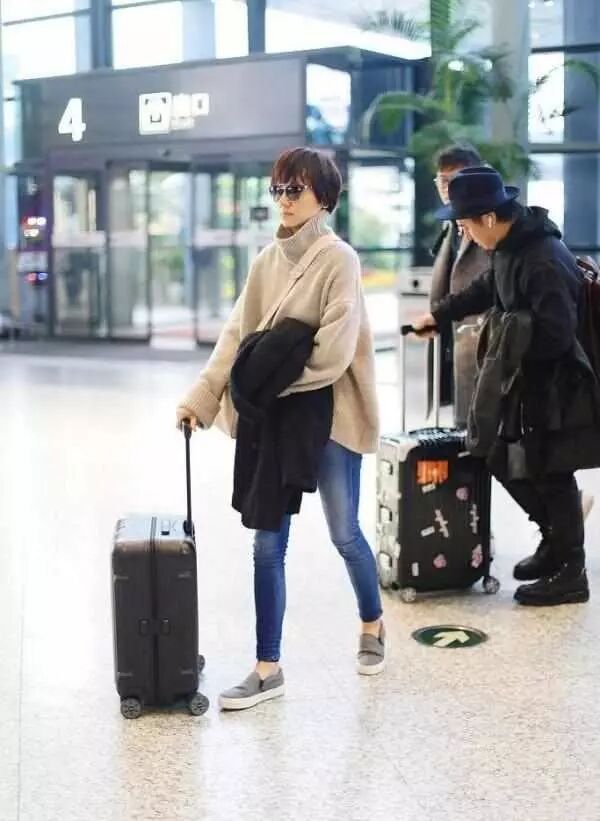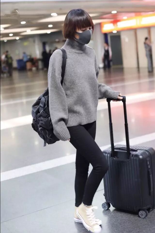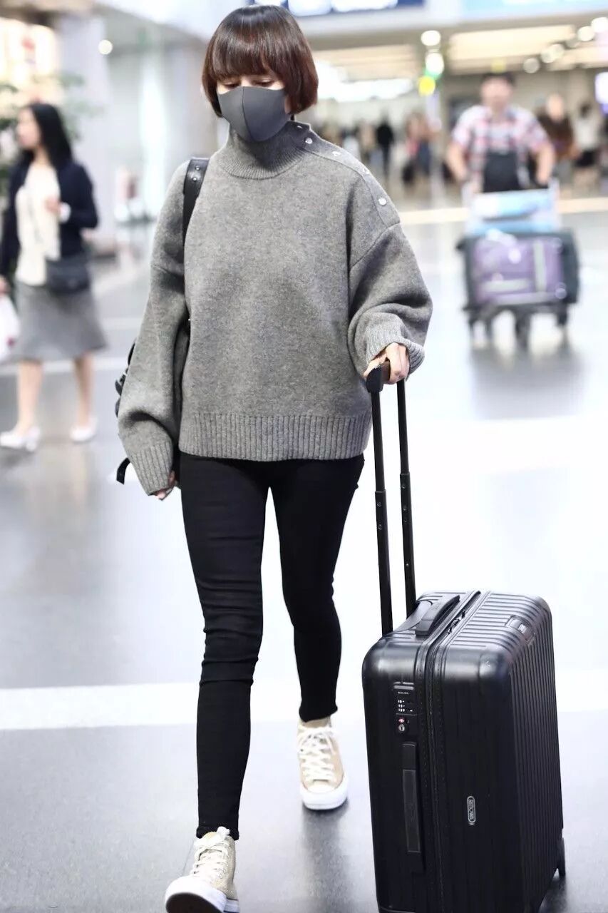 袁泉算是一股清流了,在機場的一身打扮可是超顯氣質的,灰色oversize高領毛衣總給人一種高級質感,一側肩膀利用銀色紐扣點綴,非常別致,讓這件衣服充滿了個性色彩。