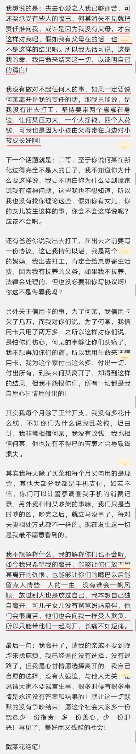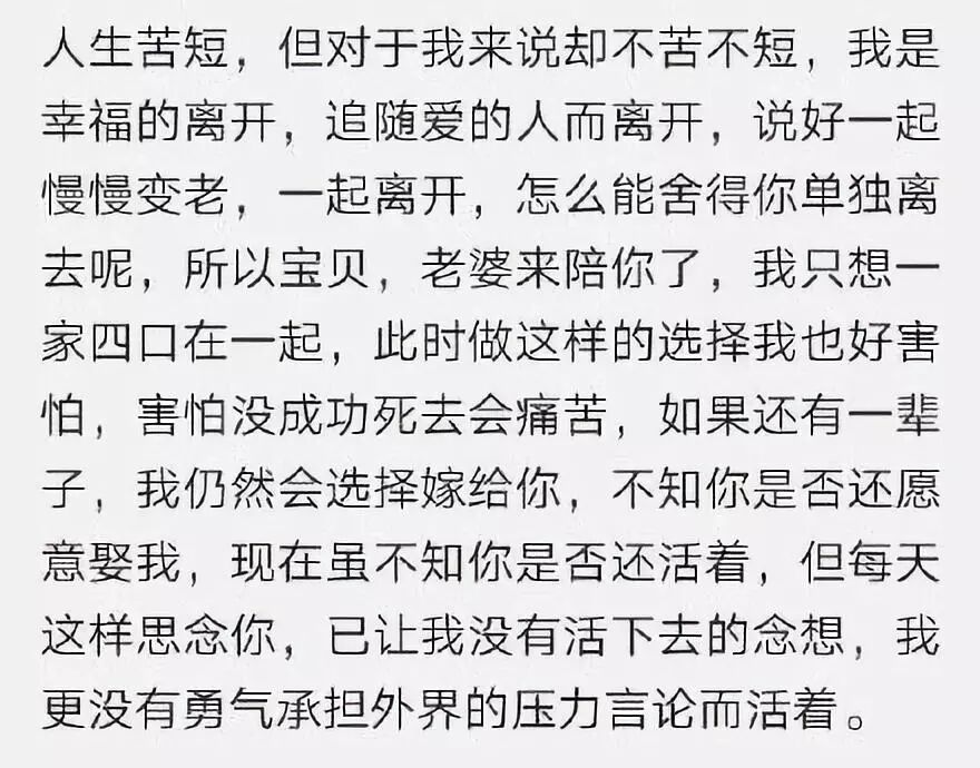 多年前我曾讀過歐亨利一篇短篇小說:《麥琪的禮物》 故事講的是社會底層一個小家庭在聖誕節前發生的故事。 男主人吉姆是一位年輕的小職員,他做著一份薪水僅夠艱難維持一家生活的工作。他的妻子名叫德拉,是一位漂亮賢惠的女子。 雖然他們生活貧窮,可他們各自都有一件自己最珍貴的「寶物」 吉姆是一塊祖傳的金表,而德拉是一頭如瀑布般美麗的秀發。 貧窮的兩人是相愛的,他們都想給對方送一件聖誕節禮物。 於是吉姆賣掉了自己的金表,為德拉買了一整套純玳瑁做的,還鑲嵌寶石的梳子,用來梳她那一頭秀發。 而德拉賣掉了自己一頭長髮為吉姆買了一條精致的白金表鏈,用來配上那塊祖傳的金表。 回到了家,本想給對方驚喜的兩人都懵了。 他們為了對方捨棄了自己最寶貴的東西,可換來的禮物卻也因此變的毫無作用了。 最終兩人把東西放到了一邊,煎起了肉排,依舊幸福的過起了聖誕節。 兩個生活在底層的小人物,卻深深相愛著。他們願意為了對方拿自己最寶貴的東西去交換。在這種溫暖的感情面前,貧窮好像真的可以變得微不足道。 雖然最終他們失去自己最寶貴的東西,買來的禮物也無價值,可他們也得到了最好的,那就是彼此無價的愛。 好的婚姻或許就是這樣,彼此愛著,彼此付出,彼此是對方最寶貴的存在。 2 而今天,我卻在微博上看到了一個和小說內容有點相似的事件。 只是,現實總是讓人哀嘆。小說中美好的感情到了現實中卻變得暗黑的多,好像愛總不能得到完美的回報。 一樣是社會底層的貧窮家庭。 5年前戴某花嫁給了比自己大三歲的何某,自小戴某花就父母雙亡,何某成了她唯一的依靠。她很愛他,婚後兩人共育了一兒一女。他賺錢,她照顧孩子,看起來也算是平凡而又幸福。 可是在9月19日,何某突然駕車失蹤了。10天後失蹤車輛在河中被發現,何某生死未明。 已經過了這麼多天,一家人也早已失了希望,在何某失蹤的第21天,戴某花也帶著一雙兒女離開了,而在她的微信朋友圈里,留下了一封1000多字的「絕筆書」。 而後,當地搜救人員就在河中找到了母子三人的屍體,她們都溺水而亡。 而那封絕筆信,看的讓人心酸。 開頭的第一段,就能感覺到,生前他們的關係一定很好,至少她一定很愛很愛自己的丈夫: 「說好一起慢慢變老,一起離開,怎麼能捨得你單獨離去呢?所以老婆來陪你了。」 「如果還有下輩子,我仍然會選擇嫁給你,不知你是否還願意娶我。」 而致使她殉情的又真的是因為接受不了丈夫離開的愛嗎? 不,逼死她的其實就是老公的家人們。 從絕筆信中可以看到,在何某失蹤後,一家人開始把責任推給了她。他們認為,因為她在家帶兩個孩子沒有出去打工,還亂花錢,所以何某一個人養一家人太難,壓力太大,所以才會走到今天這個地步的。 而何某的爸爸,在戴某花準備外出打工賺錢養兩個孩子時,卻在逼著她寫下協議,承諾一定會給錢撫養兩個孩子。 她並沒有亂花錢,為了證明她願意公開帳單。她也並沒有想過要丟下兩個孩子,家人的不信任再次給和戴某花一個重重打擊。 而在絕筆信中還提到了信用卡。為了何某,她名下的信用卡還欠了好幾萬。她害怕家人擔心還隱瞞了他們,想著努力去還。她為了這個家付出了太多,最終卻得來這樣的結果,這讓她很崩潰。 所以為了「自證清白」,為了不讓孩子像自己一樣因為沒有爸媽而遭受到欺負,所以最終決定帶著孩子一起離開。 她對丈夫,真的是愛的純粹吧?連自己的生命都捨得放棄。 而她能狠心的帶著兩個孩子自殺,也一定是攢夠了失望吧? 就在戴某花為了何某付出生命後,轉折卻來了。 在戴某花和兩個孩子離世的第二天,那個失蹤的何某出現了。他來到了派出所投案自首。 原來,他為了逃避欠下的十餘萬網貸,隱瞞了妻子在保險公司買了一份賠償金額為100萬的人身意外險。他利用借來的車偽造了墜河現場,造成車毀人亡的假象,企圖騙保險金。 那份保險受益人寫的是戴某花的名字,可是戴某花和孩子卻也因此死亡了。 崩潰的他投案自首,因涉嫌故意毀壞財物罪和保險詐騙罪被刑事拘留了。 這真的是一場悲劇版的《麥琪的禮物》 保單就是那份「禮物」,可最終隨著三人的離開,也再無了意義。而他,也要為自己的違法行為,付出代價。最終誰也不是贏家。 而我們也不知道,在這場悲劇中,愛到底是不是相互的。 戴某花是愛著何某的,可卻因為他的死亡還有家人的冷漠而寒了心。 而那個將受益人名字寫為戴某花,得知死亡崩潰自首的何某,究竟是真心相愛,還是愧疚感,或許只有他自己才知道了。 3 都說壞的婚姻,就是殺人。 沈麗君因為丈夫長期出軌,小三的挑釁,婆婆的偏袒,最終身患癌症的她從高樓一躍而下。 她在遺書的開頭寫著:不幸的婚姻如此雷同 她在遺書的最後寫著:自己選的路,如今卻讓我走投無路。 這個世界上還有多少的戴某花沈麗君,在婚姻中,因為伴侶和伴侶家人的言語/身體暴力,一點點心涼?最終崩潰到用他人的錯誤懲罰了自己? 可是誰都知道,死亡從來不是結局。 在死亡後,往往對方消沉一段時間後,最可能的結果是什麼? 找了新的伴侶,生了新的孩子,吃喝玩樂,有錢有閒,浪的自在……. 可那些被婚姻殺死的人,死了卻什麼也沒了,也永遠的敗了。 4 生活中像《麥琪的禮物》里那樣純粹的愛情有很多,但像戴某花那樣的悲劇也不少。 我們會因為戴某花的經歷恐慌,也一樣會期