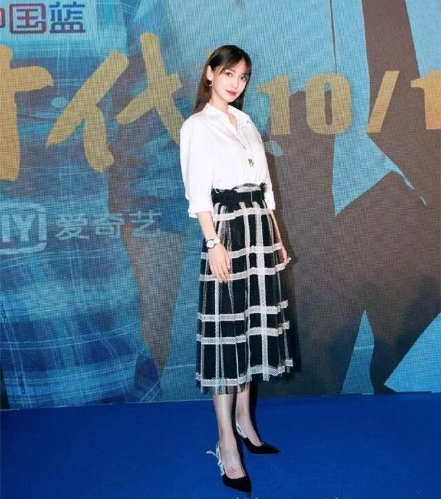 楊穎就是走氣質路線的,穿白色襯衫搭條格子半身裙,好優雅淑女,將扣子稍微解一顆,也挺有女人味的。