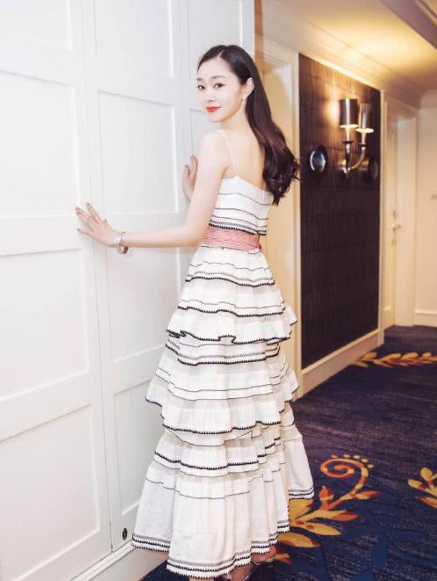 宋軼真的挺瘦的,穿白色的蛋糕裙,不僅沒有顯臃腫還挺苗條的,條紋的設計也挺時尚的,只是吊帶的設計,將她的副乳都有點勒出來了。