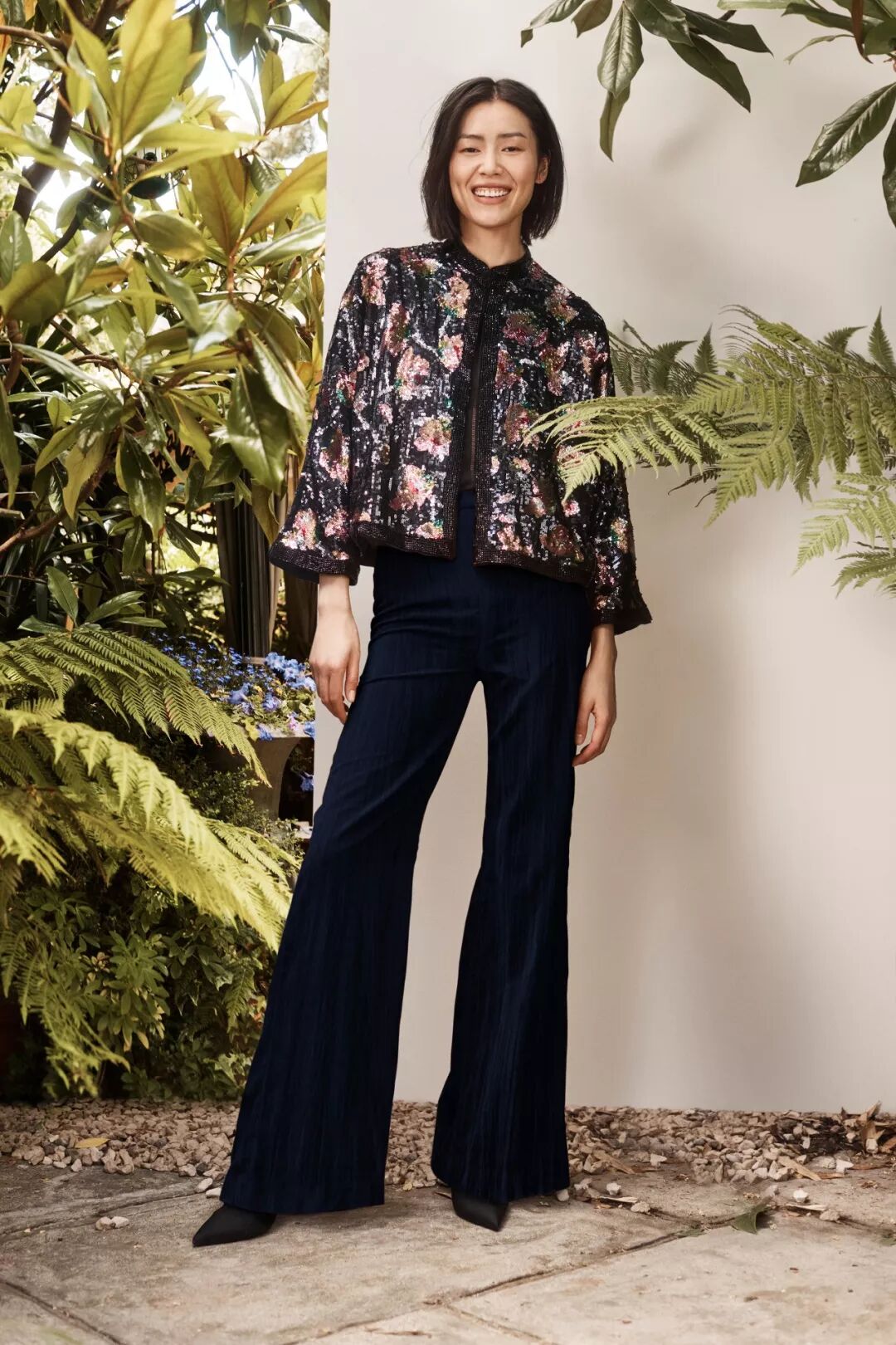 從高定秀場到快消單品,新型面料始終占據一席之地。從一塊古老壁毯的遺失碎片中獲得靈感啟發,H&M 秋冬環保自覺行動限量系列將歷史藝術品的生命歷程與最新的可持續面料創新技術相融合。再生羊毛和採用再生聚酯纖維制成的天鵝絨在該季系列中首度亮相,幾乎所有單品都是以可持續材質打造:採用回收PET瓶制成的全身鑲亮片的花朵夾克、以回收塑膠制成的雕塑感耳環、再生聚酯纖維材質的黑色襪靴、採用再生聚酯纖維和TENCEL™天絲混紡制成的露跟綁帶高跟鞋……富有戲劇感和浪漫色彩的廓型設計,在戲劇性與精致考究之間取得了巧妙的平衡。