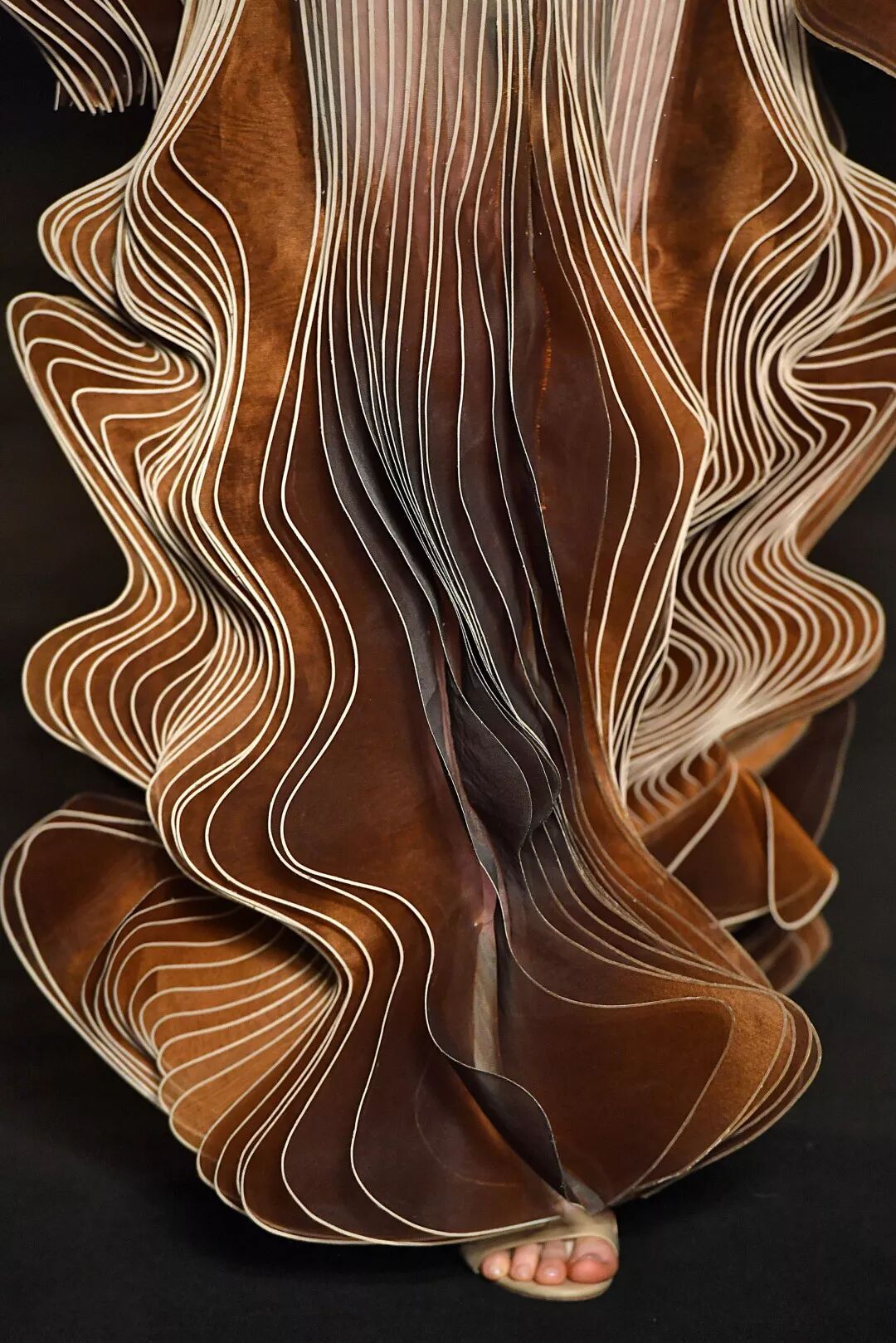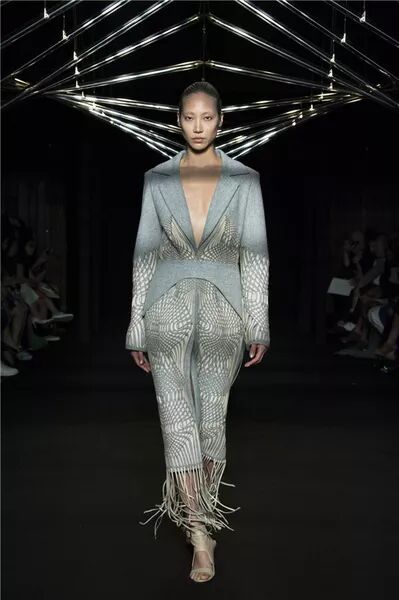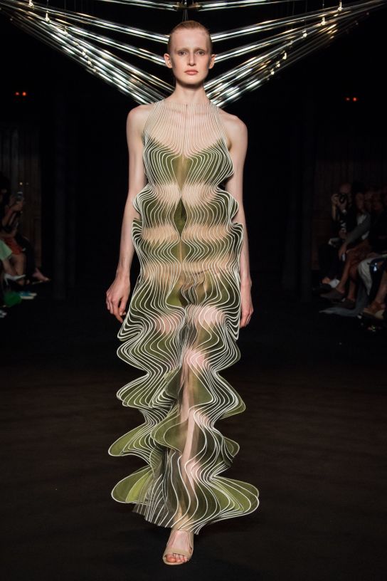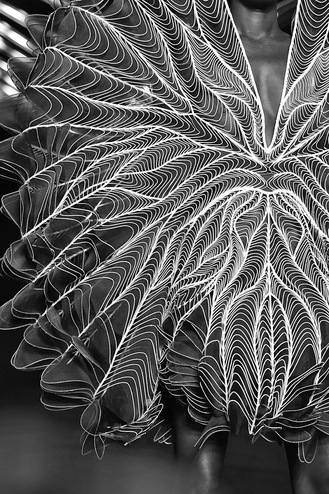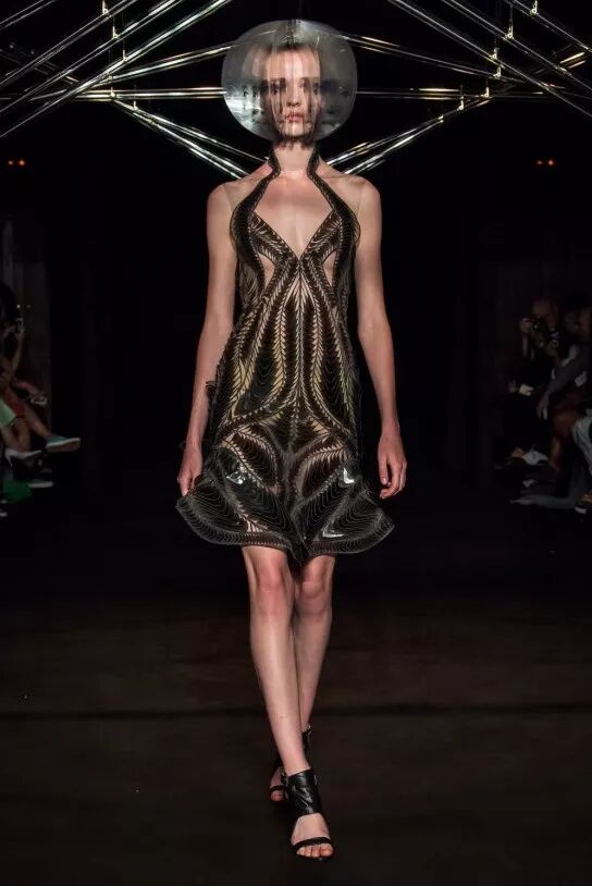 設計師依舊運用3D列印技術,將繁復的工藝和輕紗材質完美結合,大膽探索合成生物學以及有機和無機物質交錯而誕生的全新領域:傳統編織與先進數位設計編織工藝相互交錯,通過參數制圖將雷射剪裁的羊毛織入皮革;絲質歐根紗經褶皺效果和液體塗層處理,以不同方向折疊再層疊,將動態放緩,與動力裝置的玻璃線條交相輝映;迷你「Mimesis」緊身裙以鳥聲波圖紋呈現,採用聚脂薄膜、黑色純棉、紅色歐根紗和透明黑色丙烯薄片等材質,將絲綢和丙烯以羽毛的結構層疊構造。