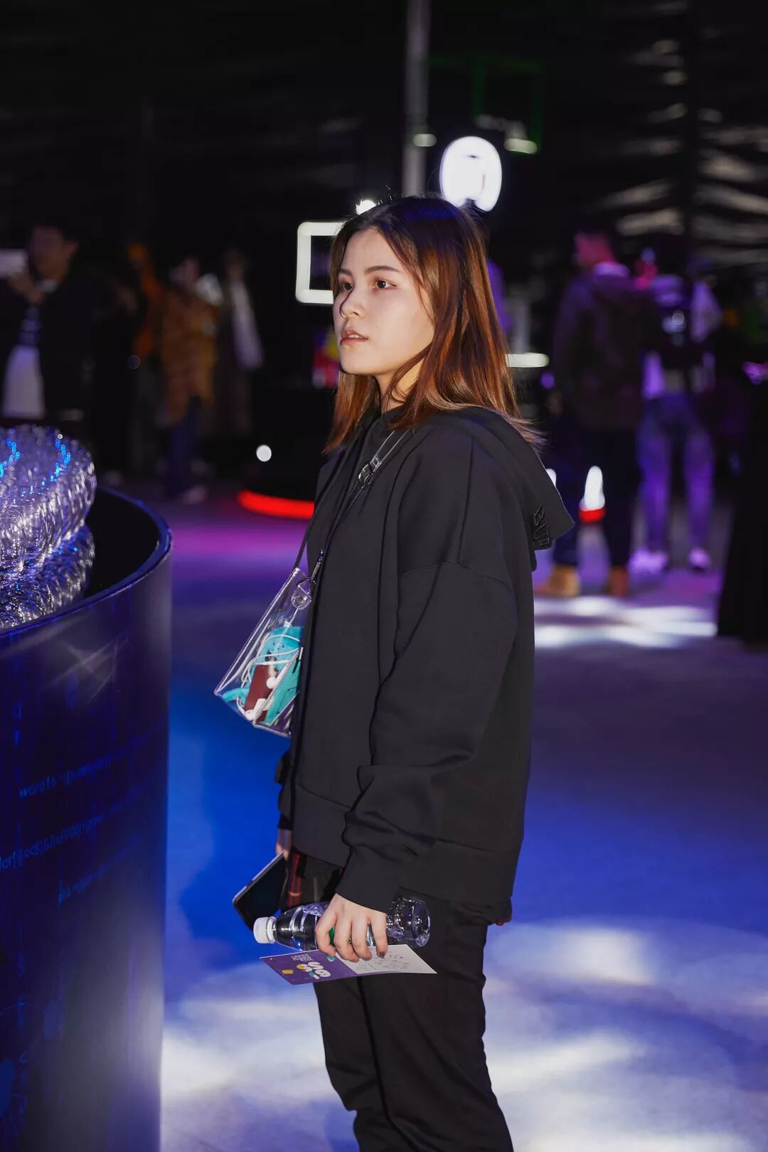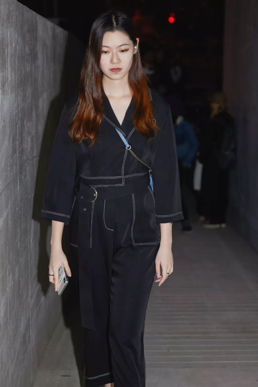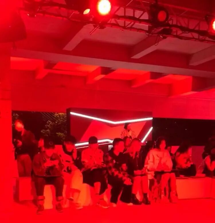 從上樓梯開始,整個通道到秀場都是紅色的昏暗燈光,台上有DJ,感覺不是來了秀場,而是去了夜場,不過感謝動感的音樂和現場的⽓氛讓我很快就暖和了起來!
