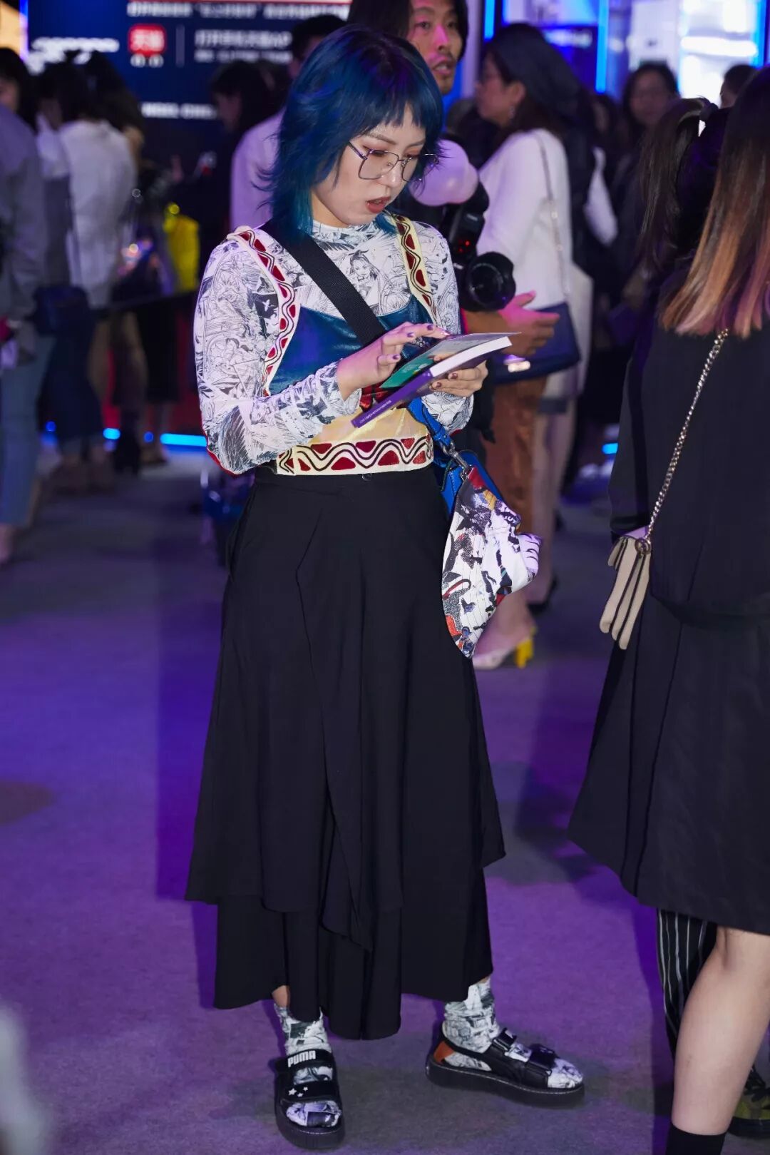 「參加時裝周的人真的很多。秀場是人,秀場周圍也是人!而且讓我最印象深刻的,就是有一位穿著皮草,嘴唇是紫色的,還畫著煙熏妝的男人。真的挺厲害的。