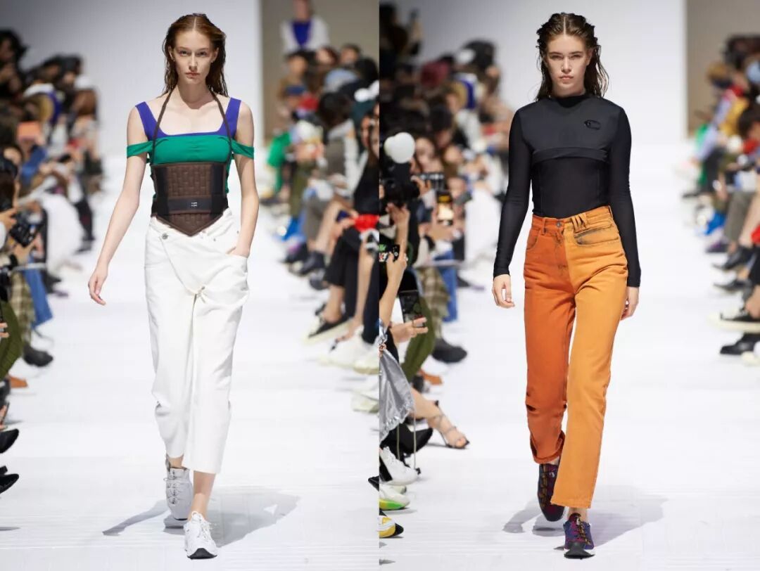 但是整場秀還是看的很開心,感覺大家都很喜歡這些設計;我看到前面十套左右的時候,套裝基本上以黑白或者暗沉的色調為主,還有一些拼接的牛仔布料,風格是比較幹練簡潔的。後半段的設計稍微顯得大膽一些,有今年流行的紫色和綠色的拼接,還有粉色的類似卡紙卷起來的裙子和一些褶皺的偏光禮服,感覺更多的想表達女性的柔美。