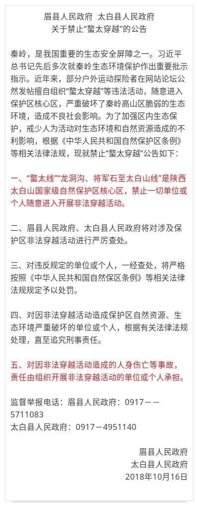 近年來,部分戶外運動愛好者在網站論壇、微信等多個平台公然po文。擅自非法組織「鰲太穿越」等活動,隨意進入太白山自然保護區核心區。嚴重破壞了秦嶺高山區脆弱的生態環境,人員傷亡事故也逐年上升,造成不良社會影響。