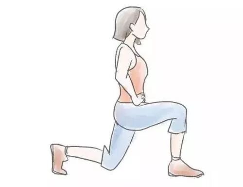 右腿弓步向前,左腿跪在墊子上,雙手叉腰,背部挺直,收緊腹部。 重心前移,充分伸展髖前部,打開下肢動脈流動空間,提高營養供給。