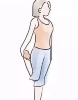 左腳站立,右腿膝屈置於臀後。右手握於右腳踝,保持身體平衡。收緊腹部,背部挺直。 右手將腳踝盡量靠近臀部,拉長大腿前側肌群,優化腿部線條。也可採取側臥位的方法。