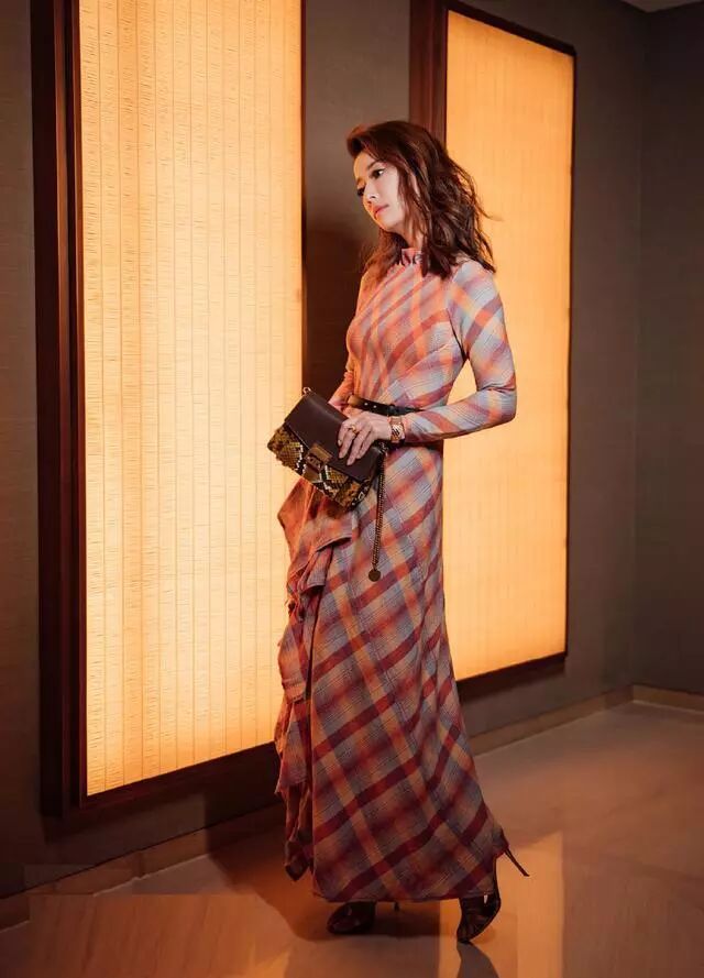 林心如這一身復古風打扮,很有時尚氣息,身穿格紋連衣裙,大氣優雅同時也能彰顯氣場。