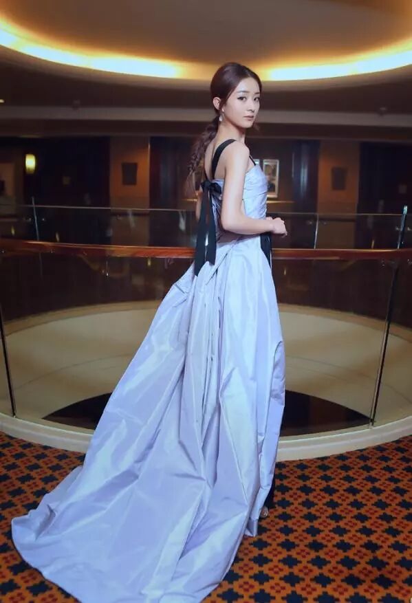 薰衣草的淡紫色把趙麗穎的皮膚稱的十分白皙,吊帶和腰間的蝴蝶結十分有女人味,側面開叉的款式又能露出她的大長腿,性感又有氣質。